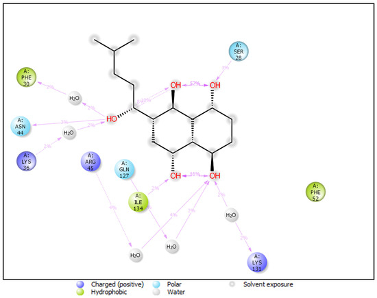 The protein-ligand complex was found less flexible however, the RMSF plot indicates variations in certain regions. During the simulation, ASN44, ILE134, and SER28 form hydrogen bond backbone interactions, while PHE30, LYS36, ARG45, GLN127, and LYS131 form hydrogen bond sidechain interactions. There are five water molecules directly involved in the hydrogen bond to the backbone of the protein-ligand complex. PHE30 and ILE134 form hydrophobic interactions while the backbone interactions LYS131, LYS36, and ARG45, participate in positively charged atom interactions. ASN44, GLN127, and SER28 are involved in forming polar molecular interactions (Figure 11).