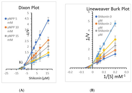 Kinetic analysis was performed at different concentrations of the substrate (pNPP) and Shikonin to clarify the mode of enzyme PTP1B inhibition. Shikonin exhibited competitive inhibition against both PTPs (Ki = 7.5 M) (Figure 13). A lower Ki value can mean more effective inhibition against the enzyme system in the production of preventive and therapeutic agents because the Ki value represents the concentration required to form an enzyme-inhibitor complex.
