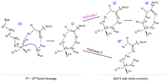 The glutamine residue at this position in the enzyme active site is common for many GTPases, in particular, for Gln61 from GTPase Ras in the widely studied complex Ras-GAP (p21Ras-p120GAP). During the long history of studies of the GTP hydrolysis mechanism in GTPases [18,44,45,46,47,48], several proposals have been put forward concerning the role of this residue for the GTPase catalysis. There is a consensus about the importance of this residue for positioning the nucleophile water molecule for an attack on the γ-phosphate; however, a more active role of Gln61 in the Ras-GAP catalyzed GTP hydrolysis is still debated [30,31,32]. In line with the previous simulations of GTP hydrolysis by Ras-GAP [30] consistent with the glutamine-assisted mechanism, pathway-I of this reaction in Arl3-RP2 assumes that the side chain of Gln71 participates in proton transfer after cleavage of the of the O3B–PG bond in GTP. As a result, the protonated form of Gln71 appears in the intermediate I2, and the imide tautomer of the glutamine side chain appears in the intermediate I3I. Pathway-II does not suggest the appearance of the imide form of Gln71, but actively explores the occurrence of the intermediate I2 with the protonated form of Gln71.