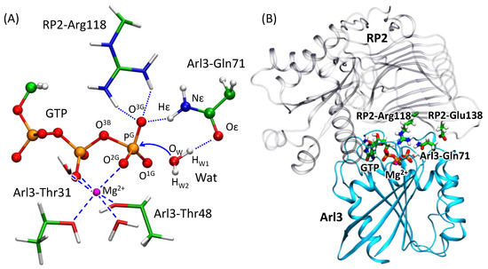 According to experimental studies [21,22], the RP2 partner of the complex performs in the hydrolysis reaction as a GTPase-activating protein (GAP). Similar to other GTPases, the intrinsic hydrolysis rate of Alr3 is very slow (1.2·10−5 s−1), but upon binding to RP2, the reaction rate increases dramatically to 1.2 s−1. Several amino acid residues from RP2 are important for efficient hydrolysis. The RP2-Arg118 is a so-called “arginine finger” and its mutation to alanine decreases kcat to approximately the same amount as in the intrinsic hydrolysis by Arl3 [21]. The value of arginine fingers in the enzyme catalysis is well recognized; see, for example, [23,24,25]. The role of another RP2 residue, Glu138, is also underlined in [21]; its mutation to the alanine results in a 100-fold decrease of kcat in comparison with the wild type Arl3-RP2 complex.