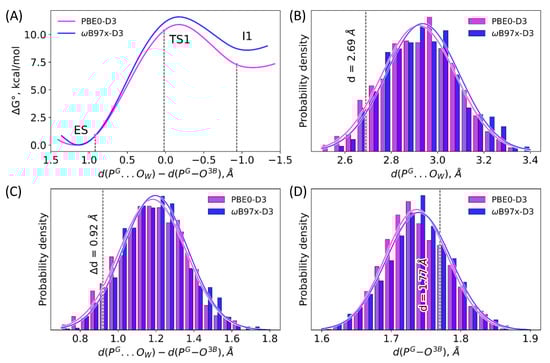(A) Gibbs energy profiles of the first reaction step obtained in QM/MM MD simulations. (B–D) Distributions of the d(PG–O3B), d(PG…OW) and d(PG…OW)–d(PG–O3B) distances in the unconstrained QM/MM MD simulations. Black dashed lines correspond to the reaction coordinate values (A,C) and individual interatomic distances (B,D) extracted from the stationary points on PES [26]. Magenta and blue curves correspond to the calculations obtained with the PBE0-D3 and ωB97x-D3 functionals, respectively.