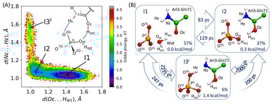 (A) Projection of the QM/MM MD data on the two interatomic distances d(HW1…Oε) and d(Hε…Nε); (B) Transitions between macrostates (I1, I2 and I3I) obtained in the MSM analysis. Relative populations of the corresponding macrostates and their relative energies are indicated in the boxes. Values in arrows report the transition times.