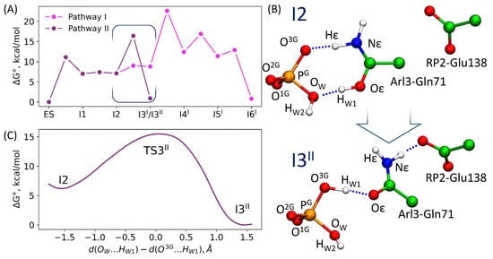 So far, we have described the reaction route revealed in the previous QM/MM calculations and confirmed in the present QM/MM MD simulations. We call it pathway-I, and the reaction intermediates and transition states along this route are marked by the superscript “I”. Here, we describe an alternative route (pathway-II), revealed in the present QM/MM MD simulations. For this goal, we analyzed the experimental data on point mutations [21]. The RP2-Glu138 is located quite apart from the active site (Figure 2); however, its mutation results in the decrease of the reaction rate up to the values found for the intrinsic hydrolysis by Arl3 [21]. From the results presented in Section 3.2 and Section 3.3, we also learned that the I2 intermediate is ~6 times more populated than I3I (Figure 6). This intermediate corresponds to the protonated form of the Arl3-Gln71 side chain. Therefore, we explored pathway-II, assuming the shift of Gln71 toward a prospective hydrogen-bond partner, the RP2-Glu138. This re-arrangement is coupled with proton transfer from Oε(Gln71) to the inorganic phosphate (Figure 7). To quantify this transition, we suggested the reaction coordinate for the umbrella sampling simulations as a difference between two distances, d(OW…HW1) and d(O3G…HW1). Calculations performed with the PBE0-D3 functional allowed us to estimate the energy barrier of transition from I2 to I3II as 9.3 kcal/mol (the superscript “II” distinguishes the intermediates on pathway-II).