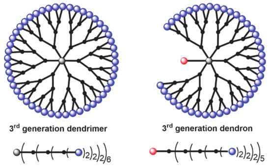 Being interested since a long time in the field of dendritic structures [15] and their applications [16], we have widely used hexa-substituted cyclotriphosphazene as core of dendrimers [17], but also in a few cases AB5 derivatives of cyclotriphosphazene as building block for the construction of dendrimers. Dendrimers are hyperbranched macromolecules, synthesized step-by-step from a multifunctional core, by an iterative process, which generates a new “generation” each time the number of terminal functions is multiplied. Another family of dendritic molecules is called “dendrons” when one function at the level of the core is different from the others, which are used for the growing of the branches. Dendrimers and dendrons, both of third generation, are schematized in Figure 1. They are represented as two-dimensional structures, but they have three-dimensional shapes. In the lower part of Figure 1 is represented another way to draw dendrimers and dendrons, i.e., a linear form, with parentheses after each layer of branching points, with a number indicating the multiplicity at the considered layer. Multiplication of all these numbers gives the number of terminal functions (2 × 2 × 2 × 6) = 48 for the dendrimer, 2 × 2 × 2 × 5 = 40 for the dendron, as shown in Figure 1.