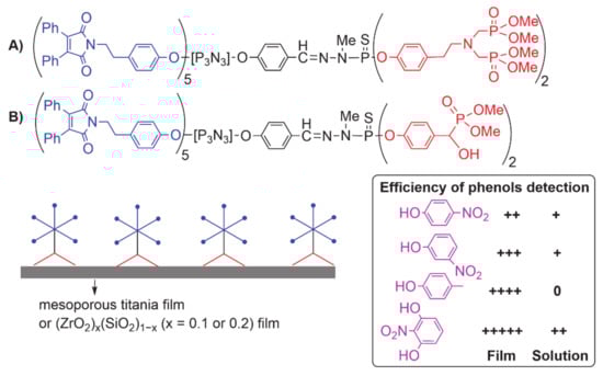 Dendrons grafted to solid surfaces. (A) Dendron grafted to mesoporous titania films. (B) Dendron grafted to (ZrO2)x(SiO2)1−x films surface. In the frame: efficiency of the dendron shown in (A) on titania or in solution for the detection of nitrophenols.