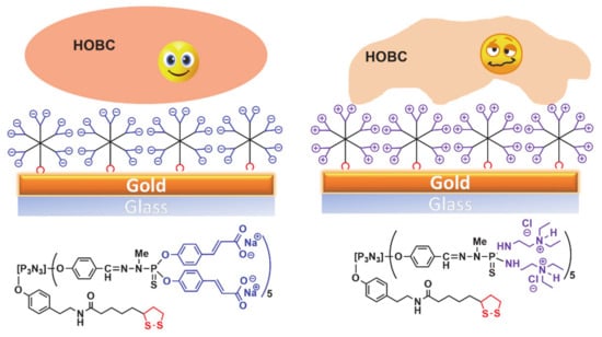 - de Jong, E.R.; Deloch, N.; Knoll, W.; Turrin, C.O.; Majoral, J.P.; Caminade, A.M.; Koper, I. Synthesis and characterization of bifunctional dendrimers: Preliminary use for the coating of gold surfaces and the proliferation of human osteoblasts (HOB). New J. Chem. 2015, 39, 7194–7205. [Google Scholar] [CrossRef]