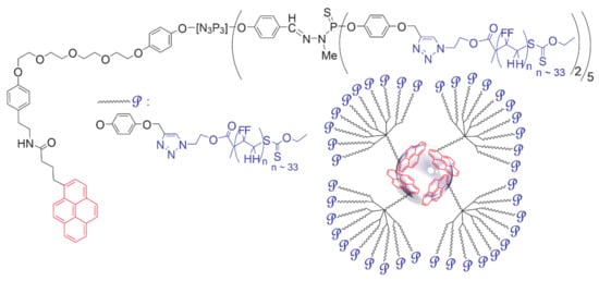 In another example using the pyrene-graphene association, the link between the dendron and the pyrene was longer than in the previous case. In this case, five hydroxybenzaldehydes were first grafted to the cyclotriphosphazene, prior to the pyrene derivative. The surface of the dendron was functionalized with poly(vinylidene fluoride) (PVDF) polymers, using a Huisgen [3 + 2] cycloaddition (“click chemistry”). PVDF is an interesting fluoropolymer, constituted of CF2-CH2 units. It has remarkable properties such as thermal stability, chemical inertness to solvents and acids as well as piezo-, pyro- and ferroelectric properties [36]. The dendron shown in Figure 4 was used to interact by π-stacking with the graphene surface of cobalt NPs covered by graphene layers. A thermo-responsive behavior was displayed, showing that the interaction is reversible when heating, in accordance with the previous cases shown in Scheme 12 and Scheme 13 [37].