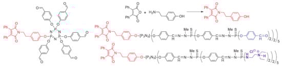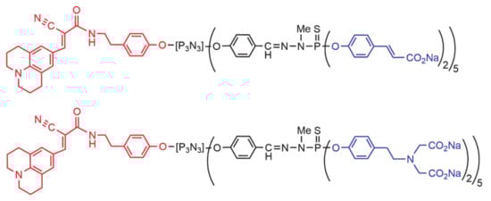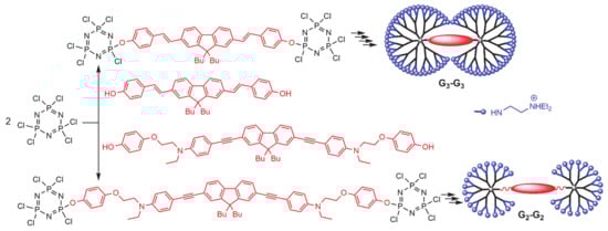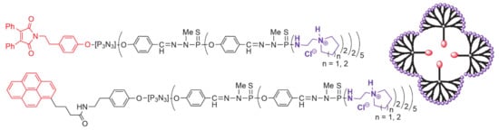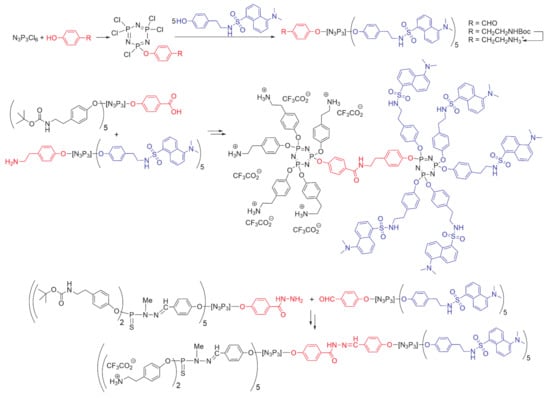 - Hameau, A.; Fuchs, S.; Laurent, R.; Majoral, J.P.; Caminade, A.M. Synthesis of dye/fluorescent functionalized dendrons based on cyclotriphosphazene. Beilstein J. Org. Chem. 2011, 7, 1577–1583. [Google Scholar] [CrossRef] [PubMed]