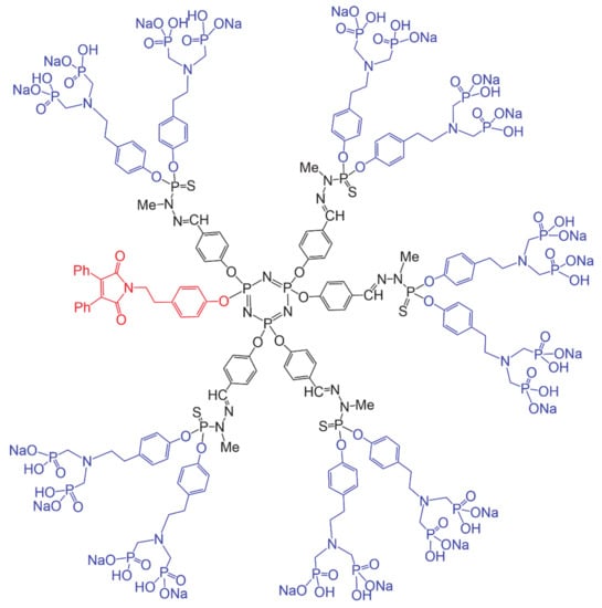 - Rolland, O.; Turrin, C.O.; Bacquet, G.; Poupot, R.; Poupot, M.; Caminade, A.M.; Majoral, J.P. Efficient synthesis of phosphorus-containing dendrimers capped with isosteric functions of amino-bismethylene phosphonic acids. Tetrahedron Lett. 2009, 50, 2078–2082. [Google Scholar] [CrossRef]