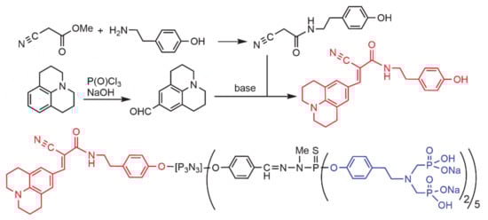 In view of all the properties of the dendrimers ended by azabisphosphonate terminal functions, a structure/activity relationship was carried out, together with the desire to decipher their complex interactions with biological processes. Indeed, it was demonstrated that this family of dendritic compounds offers an alternative strategy to the treatment of chronic inflammatory diseases such as rheumatoid arthritis [46] and multiple sclerosis [47]. Besides maleimide, other fluorescent groups were linked to the core of the dendrons, in particular based on julolidine to help in deciphering the biological mechanism of action. Indeed, the tracking of cellular or molecular events often requires the use of fluorescent labels. In this regard, having in hand several fluorescent analogs of a given compound with various λem/λex is somehow convenient to design biological experiments. The suitably functionalized julolidine was synthesized first by a Vilsmeyer formylation on commercially available julolidine, to obtain 4-formyljulolidine in quantitative yield. In parallel, the reaction of cyanomethyl acetate with tyramine afforded quantitatively 1-cyano-N-acyl tyramine. Coupling of both compounds by Knoevenagel condensation proceeded in high yield to get the desired julolidine derivative equipped with a phenol (Figure 8). This compound was used for grafting to the single remaining chloride of cyclotriphosphazene equipped with five benzaldehyde functions. The growing of the branches and the grafting of azabisphosphonate functions afforded the desired fluorescent dendron. This dendron was also efficient for inducing the activation of monocytes [48].