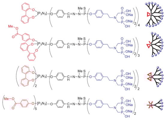 The family of dendritic structures having azabisphosphonate terminal functions has been expanded by decreasing the number of terminal active functions, in order to determine the influence of surface loading on the biological properties. This goal was attained by playing with the specific functionalization of cyclotriphosphazene. The case of five reactive functions and one non-active has been exemplified in several previous Figures with a fluorophore being the non-reactive function (Figure 7, Figure 8, Figure 9 and Figure 10). Two non-active functions were obtained by reacting first 2,2′-dihydroxybiphenyl on N3P3Cl6. The reaction occurred on a single phosphorus atom, leading to a seven-membered heterocycle. The growing of the dendritic branches was carried out starting from the four remaining chlorides. Three non-active functions were obtained by reacting first one equivalent of 4-hydroxymethylbenzoate, then one equivalent of 2,2′-dihydroxybiphenyl on N3P3Cl6, affording AB2C3 derivatives. Four non-active functions were obtained by reacting two equivalents of 2,2′-dihydroxybiphenyl on N3P3Cl6. Finally, five non-active functions were obtained by reacting five equivalents of 4-hydroxymethylbenzoate on N3P3Cl6. In all these cases, the growing of the remaining branches was carried out up to obtaining azabisphosphonate terminal functions (Figure 11) [48].