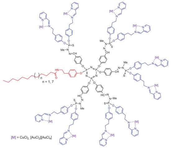 Another recent result concerns a series of dendrons having an alkyl chain (C11H23 or C17H35) at the core, and pyridine-imine functions on the surface, suitable for the complexation of metals such as copper or gold [58]. The alkyl chain was grafted in the second step of the synthesis process, on a cyclotriphosphazene already functionalized with five equivalents of hydroxybenzaldehyde. The full structure of the first generation of this family of dendrons is shown in Figure 13. The corresponding plain dendrimers were synthesized before, and complexed with either copper or gold, or with a mixture of both metals. The copper complexes of the dendrimers were obtained by reaction of CuCl2. The third-generation dendrimer was found very efficient against a panel of human cancer cell lines, with IC50 values ranging 0.3−1.6 μM, whereas CuCl2 alone at the same concentration displayed no cytotoxicity [59]. An original mechanism of action of these dendrimers was proposed. The penetration in cells occurred by endocytosis, then the potent apoptosis activation could be related to a noticeable translocation of Bax (a proapoptotic protein) to the mitochondria, resulting in the release of AIF (Apoptosis Inducing Factor) into the cytosol, its translocation to the nucleus and a severe DNA fragmentation, without alteration of the cell cycle [60]. Later on, it was shown that replacing copper by gold, i.e., CuCl2 by [AuCl2][AuCl4] strongly increased the antiproliferative activities against both KB and HL-60 tumoral cell lines, showing IC50s in the low nanomolar range [61]. The dendrons shown in Figure 13 were tested against several aggressive breast cancer cell lines. It was shown that the cytotoxicity increased when reducing the length of the alkyl chain at the core. Furthermore, the replacement of copper by gold considerably increased the anti-proliferative activity [58], as was shown previously with the corresponding third generation dendrimers.