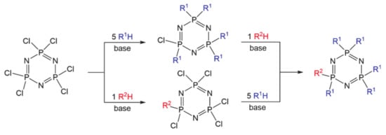 The early experiences concerning the differentiation of the reactivity of the hexachlorocyclotriphosphazene have explored the possibility to selectively react one to six chlorides, in most cases using primary or, eventually, secondary amines. Such types of work were carried out, for instance, with dimethylamine [4], ter-butylamine [5], or isopropylamine [6]. The monosubstituted derivatives were isolated and characterized in all cases, as well as several di-, tri-, tetra-substituted derivatives, and the hexa-substituted derivatives, but not the penta-substituted ones. Other early examples of reactivity concerned enolate anions of acetaldehyde, acetone, and acetophenone, using lithium derivatives [7], methylsilane and methylsiloxane, using Grignard reagents [8], and phenols, using the sodium salt [9]. In the latter case, the penta-substituted derivative was easily obtained, and frequently used.