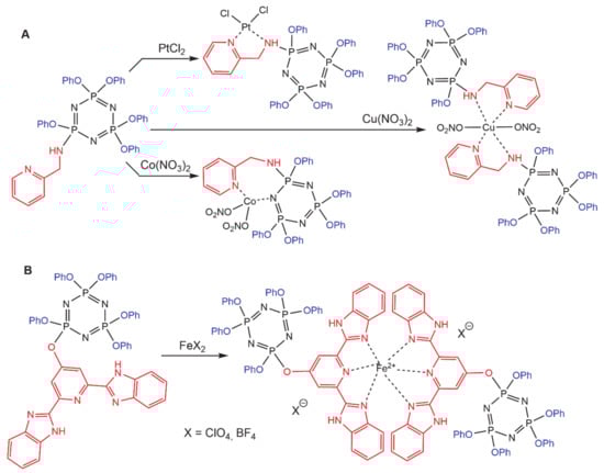 More recent results display a few practical uses of AB5 derivatives of cyclotriphosphazene, concerning in particular complexation properties, and polymerizations. The penta-phenoxy derivative was functionalized with a single 2-pyridylmethylamine ligand, then this compound was used for the complexation of Cu(NO3)2, PtCl2, and Co(NO3)2, affording a different type of complex in each case. As shown in Scheme 2A, platinum and copper complexes are monomeric, albeit different, whereas the copper complex contains two ligands [10]. Another example of complexation concerned also the penta-phenoxy derivative, functionalized with a single 2,6-bis(benzimidazole-2-yl)pyridine ligand. The reaction with FeX2 (X = ClO4− or BF4−) afforded complexes bearing two ligands around iron, as shown in Scheme 2B. These complexes are low spin below 300 K, but display spin crossover (SCO) behavior above this temperature [11].