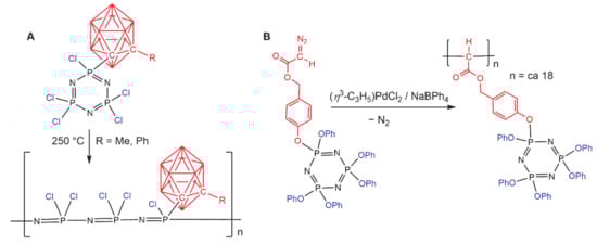 As indicated at the beginning of this introduction, cyclotriphosphazenes are widely used as precursors of polyphosphazenes. A few AB5 derivatives of cyclotriphosphazene have been used for such purpose. A carborane-substituted cyclotriphosphazene, obtained by reacting a lithiocarborane with N3P3Cl6, was polymerized when heated at 250 °C for 120 h (Scheme 3A). The Cl of the polyphosphazene were then replaced by reaction with sodium trifluoroethoxide, to avoid the hydrolytic instability of polydichlorophosphazenes [12,13]. A recent example of polymerization involved a substituent of the cyclotriphosphazene, thus it became a pendant group of the polymer. The pentaphenoxy derivative was functionalized with a single diazoacetate, which was polymerized, as shown in Scheme 3B, in the presence of a palladium catalyst [14].