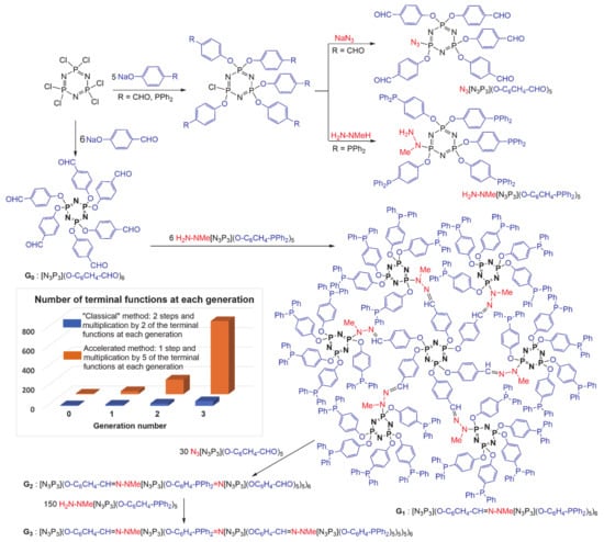 For an accelerated synthesis of layered dendrimers having a precisely defined structure, two different types of AB5 derivatives of cyclotriphosphazene were synthesized, bearing five aldehydes and one azide or five phosphines and one hydrazine. Both compounds were synthesized by reacting first five phenol derivatives, then either one azide or one methylhydrazine, as shown in Scheme 4. Starting from a hexaaldehyde core (generation 0), the hydrazine derivative was condensed to afford a first-generation dendrimer functionalized with 30 phosphines. In a second step, the azide derivative was reacted with the phosphine dendrimer in a Staudinger reaction producing P=N linkages, to afford a second-generation dendrimer, bearing 150 aldehyde terminal functions. The third and last step of the synthesis process concerned again the condensation of the hydrazine derivative with the aldehyde terminal functions, to afford the third-generation dendrimer functionalized with 750 phosphines [19]. This compound is the largest dendrimer ever synthesized in only three steps. The full structure of G0 and G1, as well as the linear structures of the four generations (G0 to G3) of this family of dendrimer is also shown in Scheme 4.