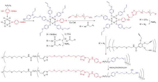 More recently, the cyclotriphosphazene was used for the synthesis of another type of “onion peel” (layered) dendrimers. The cyclotriphosphazene was first functionalized with a single N-Boc-protected 4-aminophenol, then with five p-allyloxyphenol. N-Boc-deprotection and subsequent N-chloroacetylation with chloroacetyl chloride and Hunig’s base provided a chloride function as substituent of the core, which was further substituted by an azide group using NaN3. The azide was then reacted with monopropargylated tosyltetraethylene glycol under classical “click” reaction conditions, also named Huisgen (3 + 2) cycloaddition, between an azide and an alkyne in the presence of a copper catalyst, affording a triazole [20]. Such a reaction has been frequently used for the synthesis of dendrimers [21]. Then, the tosyl group was substituted with an azide group using NaN3 (Scheme 5). The azide function of this AB5 derivative was then grafted to an octadecavalent hypercore equipped with 18 propargyl groups, again via a click reaction. The resulting dendrimer had 90 allyl terminal groups, which were finally reacted with 1-thioglycerol, to afford a dendritic structure functionalized with 180 alcohol groups [22].