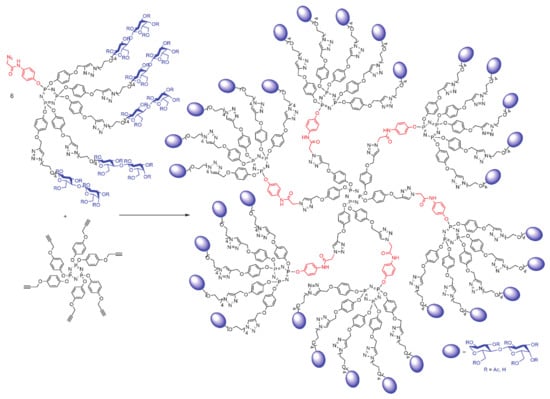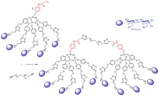 Two equivalents of the glycosylated dendron shown in Scheme 6 were associated with a tetraethylene glycol core, functionalized with an alkyne on both sides. A double-click reaction in the presence of a copper catalyst provided another type of dumbbell-shape dendrimer (Scheme 8) [23].