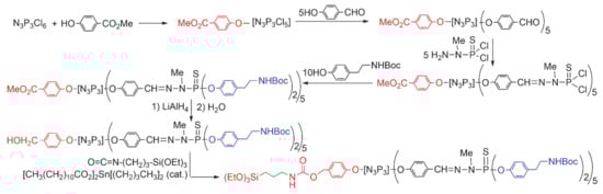 - Allcock, H.R.; Nelson, C.J.; Coggio, W.D. Synthesis and reactivity of cyclotriphosphazene bearing reactive silane functionalities: Novel derivatives via hydrosilylation reactions. Organometallics 1991, 10, 3819–3825. [Google Scholar] [CrossRef]