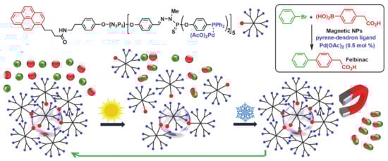 Besides the covalent grafting of dendrons to surfaces shown above, a few examples concern the non-covalent (and thus reversible) π-stacking of dendrons functionalized with a pyrene at the core on graphene surfaces encapsulating cobalt nanoparticles (Co-NPs). In the first example, the pyrene was grafted in the first step, and the surface of the dendron was functionalized in the last step with triphenyl phosphine derivatives, as suitable ligands for the complexation of palladium. At room temperature, in the presences of cobalt nanoparticles coated with a few graphene layers, the dendrons were associated to Co-NPs by π-stacking. When heating, the dendrons were dissociated from the Co NPs, and performed catalysis in homogeneous conditions. Upon cooling, the dendrons associated back to the Co NPs. Co nanoparticles are magnetic, thus the Co-NPs covered by the dendrons could be easily recovered using a magnet, and re-used. This concept is illustrated in Scheme 12, and was applied for catalyzing Suzuki couplings. It was applied in particular to the synthesis of Felbinac, which is a nonsteroidal anti-inflammatory drug. The first catalytic run gave Felbinac in quantitative yield. The catalyst and the product were cleanly and easily separated using a neodymium magnet to recover the catalytic Co-NPs covered by graphene and the dendrons. The recovered catalyst was used in a new catalytic run, in which Felbinac was also isolated quantitatively. The catalytic Co-NPs covered by the dendrons were recovered and reused 11 times, and afforded Felbinac with the same efficiency (quantitative yield) at the 12th run than at the first run (Scheme 12) [34].