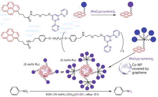 A recent catalytic-related example concerned a pyrene monomer and a small pyrene dendron (pyrene grafted in the first step), both equipped with the terpyridine ligand, suitable for the complexation of ruthenium complexes. The monomer and the dendron were non-covalently grafted as previously on the surface of cobalt NPs covered with graphene (Scheme 13). Both were used in catalyzed nitroarene transfer hydrogenation from 2-propanol. Recycling and recovery of the catalysts-Co NP with a magnet could be carried out seven times with still 100% yield in the eighth experiment with the dendritic catalyst, but not with the monomeric catalyst, which could be efficiently reused only four times [35].