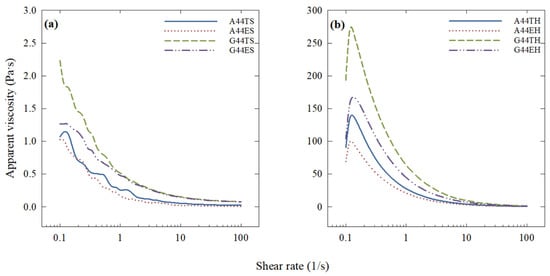 Effect of (a) primary (S) and (b) secondary (H) homogenization on the apparent viscosity of egg yolk/fish oil triglyceride (T) or ethyl ester (E) emulsions containing gum arabic (A) or gum guar (G). Each curve is the average of three replications. The viscosity of emulsions formed using secondary homogenization was significantly higher (p < 0.001) than those prepared under primary homogenization conditions. G44TH was significantly more viscous (p < 0.05) than all other treatments under the same processing conditions.