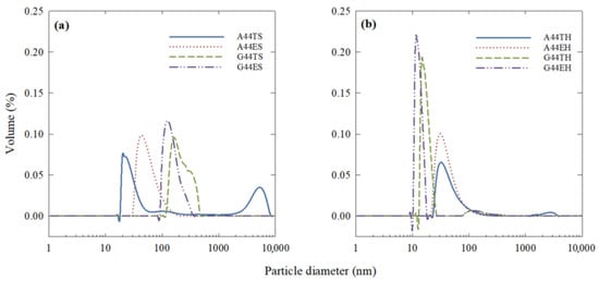 Effect of (a) primary (S) and (b) secondary (H) homogenization on the particle size distribution of egg yolk/fish oil triglycerides (T) or ethyl esters (E) emulsions containing gum arabic (A) or gum guar (G). Each curve is the average of three replications. All treatments showed a monomodal particle size distribution in the nano-size region after the high-pressure homogenization, with the exception of A44TH, which showed some residual in the micro-size region.