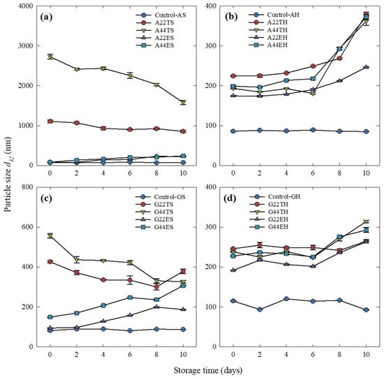 The effects of the processing conditions and time on the particle size of emulsions are shown in Figure 3a,b when gum arabic was used as a secondary layer and Figure 3c,d when gum guar was used. On day 0, the smallest average particle size corresponded to Control-AS (72.4 nm); however, this value was not significantly different from the other controls (-AH, -GS, and -GH). On the other hand, a significantly larger particle size was obtained in emulsions carrying triglycerides. Samples subjected to secondary homogenization (high-pressure homogenization at 200 MPa) showed a significantly smaller particle size (p < 0.01) than their counterparts processed only through primary homogenization. In our study, the strongest effect of high-pressure homogenization was observed in samples containing gum arabic and 22 or 44% triglycerides after secondary homogenization (A22TH and A44TH), which exhibited about 5- and 12-fold reductions in size compared to those formed using primary homogenization, A22TS and A44TS, respectively. A significant effect of storage on the particle size of emulsions stabilized by gum guar was observed only on day 10.