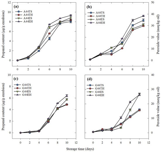 Oxidative stability of the emulsions over 10 days of storage at 45 °C. The graphs are organized to display differences between main plots (polysaccharide type, rows) and the influence of the split-plot (processing type, columns). (a) Propanal content of egg yolk/fish oil triglycerides (T) or ethyl esters (E) emulsions containing gum arabic (A) after primary (S) or secondary (H) homogenization. (b) Peroxide value of egg yolk/fish oil triglycerides or ethyl esters emulsions containing gum arabic after primary or secondary homogenization. (c) Propanal content of egg yolk/fish oil triglycerides or ethyl esters emulsions containing gum guar (G) after primary or secondary homogenization. (d) Peroxide value of egg yolk/fish oil triglycerides or ethyl esters emulsions containing gum guar after primary or secondary homogenization. Each data point corresponds to the mean ± standard error of three replications.