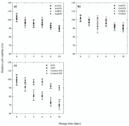 Toxicity of emulsions and nonencapsulated fish oil over 10 days of storage at 45 °C. (a) Relative viability of Caco-2 cells after treatment with egg yolk/fish oil triglycerides (T) or ethyl esters (E) emulsions containing gum arabic (A) produced by simple (S) or secondary (H) homogenization. (b) Relative viability of Caco-2 cells after treatment with egg yolk/fish oil triglycerides or ethyl esters emulsions containing gum guar (G) produced by simple or secondary homogenization. (c) Relative viability of Caco-2 cells after treatment with nonencapsulated fish oil triglycerides (FOT) or ethyl esters (FOE), and the control emulsions without fish oil (Control-AH, Control-GH) produced by secondary (H) homogenization. All samples were tested at a concentration of 75 μg fish oil/mL medium. Each point represents the mean of four to six replications ± standard error.