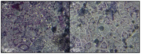 Light microscopy images displaying the purple formazan crystals resulting from the mitochondrial activity of Caco-2 cells after 24 h incubation with (a) egg yolk/fish oil ethyl esters emulsions containing gum guar (G44EH) or (b) nonencapsulated fish oil ethyl esters (FOE) on day 8 of storage.