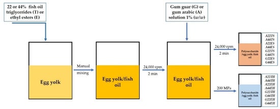 The moisture content of the freshly extracted egg yolk was determined using a convection oven set a 105–110 °C for 5 h. The 1% w/w polysaccharide solutions were prepared by stirring gum guar or gum arabic in cool Milli-Q water at 400 rpm until complete dissolution. The concentration and type of fish oil added followed the experimental design further described in Section 4.4. Egg yolk/polysaccharide emulsions were formed using two processing approaches: simple and high-pressure homogenization, as described below.