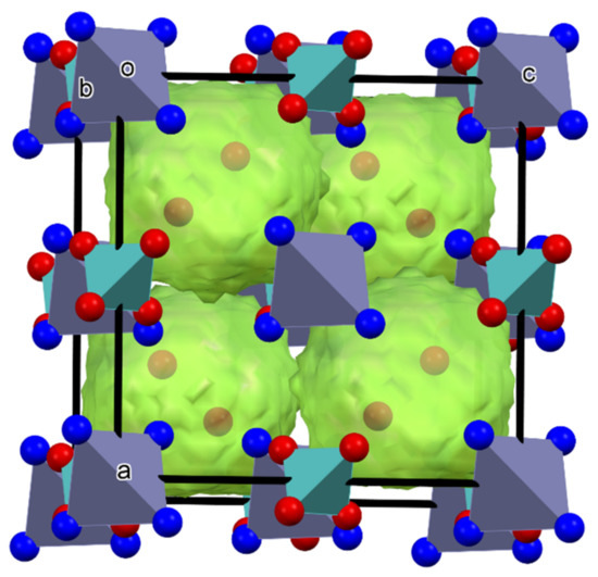 Since 1@2H2O is isostructural with the salt of monovalent cations, in the crystal lattice of 1, there is also a cation–anion network with cavities. However, since the cation:anion ratio is 1:1 in 1@2H2O, all molybdate ions are located in the cation–anion network, and there is no further anion in the compound that would, analogous to one of the permanganate ions, occupy the voids of the lattice. On the other hand, instead of the second anion, in 1@2H2O, there are two water molecules in the lattice that have no room in the cation–anion network, and it seems obvious that they are located in the cavities of the lattice, in the form of either two individual water molecules or a dimer.