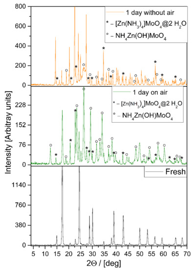 ZnMoO4 was dissolved in 25% aq. ammonia solution at room temperature by intensive stirring. The undissolved residue was removed by filtration, and, by volume, 3 times more ethanol was added to the ammoniacal solution. The formed precipitate was filtered off immediately and washed with abs. ethanol and diethyl ether.