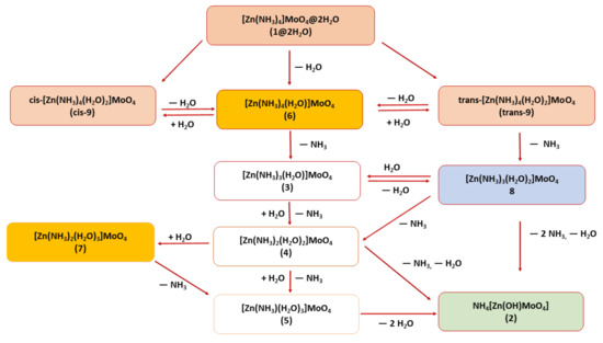 To understand the possible mechanism for the removal of ammonia ligands and the formation of ammonium ligands, we recall that the mechanism of a similar process has been determined in the case of anhydrous tetraamminecopper (II) molybdate [1]. It was shown that that compound, insoluble in water, undergoes a solid-state reaction when water molecules are available. The process was experimentally shown to start by NH3 release. The proposed mechanism is that the ammonia ligands are successively substituted by water molecules, and even the identity and structure of the intermediate mixed-ligand salts have been determined experimentally [1]. The final ammonia ligand was found to be so strongly bound to the transition metal ion that instead of leaving, it gets protonated by a water ligand coming originally from ambient humidity. It is likely that the mechanism for the decomposition of 1@2H2O in open, humid air is very similar, namely, stepwise formation of [Zn(NH3)n(H2O)4-n] complexes, where n decreases from 4 to 1 (compounds 3 (n = 3), 4 (n = 2), and 5 (n = 1)), and finally the last ammonia ligand in compound 5 is protonated by a water molecule in the lattice, yielding ammonium and hydroxide ions and with that, the formation of compound 2 (Figure 4).
