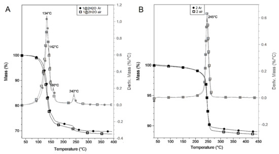 Thermoanalytical studies on compound 1@2H2O and compound 2 were performed on a TA Instruments SDT Q600 thermal analyzer coupled to the Hiden Analytical HPR-20/QIC mass spectrometer (TA ISntrument, New Castle, DE, USA and Hidden Co., Warrington, UK) and he Setaram LabsysEvo thermal analyzer (SETARAM, Lyon, France), respectively. DSC tests were performed with a Perkin Elmer DSC 7 instrument (Perkin-Elmer, Waltham, MA, USA). The details of the measurements are given in [22,29].