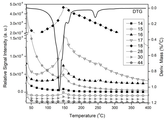 The thermal decomposition of the samples of compound 1@2H2O and compound 2 was conducted both and inert and oxidative atmosphere. The curves suggest that aerial oxygen does not significantly affect the decomposition mechanism (Figure 9A). Compound 1@2H2O decomposes at almost the same temperatures in air as in argon (the difference is less than 5 °C) and the mass of the solid residue at 400 °C is only ~1% less in air than in inert atmosphere. The overall mass loss during thermal decomposition of compound 1@2H2O up to 400 °C is 30.1% in argon and 31.2% in air, which are in good agreement with the theoretical loss (31.62%) of four ammonia and two water molecules from one dihydrate. In the temperature range from ~70 to ~200 °C, compound 1@2H2O decomposes in several overlapped processes with DTG maxima at 134, 142, and 160 °C. The evolution of enclathrated water overlaps with ammonia release. This suggests that the release of the weakly bound water becomes possible after partial disruption of the lattice. To gain better insight into the decomposition mechanism of 1@2H2O, online coupled TG-MS measurements were also done. The MS data (Figure 10) proved the simultaneous evolution of both lattice water (m/z 18 and 17) and ammonia (m/z 17 and 16) in the whole range up to 400 °C. The low-intensity peaks of fragments m/z = 14, 15, 28, 30, and 44 (N+, NH+, N2+, NO+ and N2O+) show that, due to a slight oxidizing ability of molybdate, a small amount of coordinated ammonia is oxidized by MoO42−. Up to 220 °C, the overall mass loss is 27.4 and 28.4% in argon and air, respectively, and corresponds to the loss of two water and three ammonia molecules (26.45%) per a 1@2H2O unit. The mass losses are somewhat higher than the calculated value, because a small part of the oxygen content of the molybdate ions also leaves in the form of a small amount of ammonia oxidation products. The decomposition processes at about 250 °C in both inert and oxidative atmosphere are followed by an endothermic heat effect (ESI Figure S16).