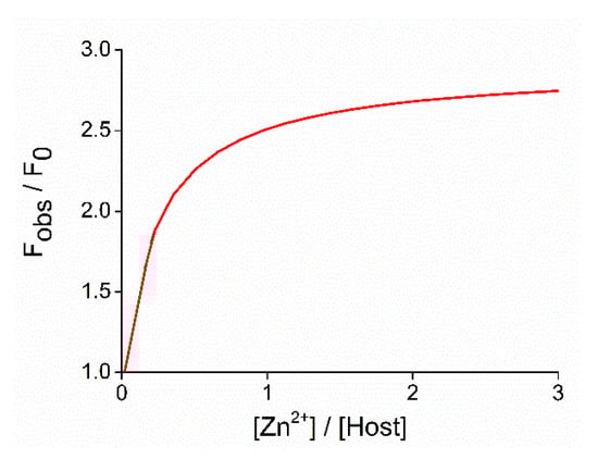 Nonlinear function globally fitted to the titration spectrum of Zn2+ over the entire wavelength range of measurements for calculating logK (Fobs refers to the observed fluorescence signal upon addition of the corresponding amount of Zn2+, while F0 is the initial fluorescence of free host 15).