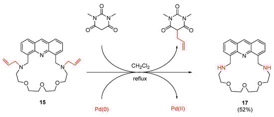 In the case of diallylamino-macrocycle 15, deprotection was carried out catalytically in mild conditions based on reported analogies [58]. This is particularly important because hard conditions and acids can induce polymerization of the allyl groups. The catalyst was tetrakis(triphenylphosphine)palladium(0), which promoted the intermolecular trans-allylation reaction between the tertiary amine and 1,3-dimethylbarbituric acid via redox-processes as shown in Scheme 4.