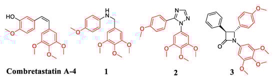 Vicinal diaryl is a simple scaffold found in many colchicine site tubulin inhibitors, which is also an important pharmacophoric point of tubulin binding and anti-cancer activity [10,11,12,13]. Natural colchicine site tubulin inhibitor combretastatin A-4 (CA-4) is a 1,2-diarylethylene analog, which exhibits potent inhibitory potency against many cancer cells including multidrug resistant cancer cells and could effectively inhibit the polymerization of tubulin [14]. However, due to the poor water solubility, low bioavailability and unstable cis double bond of CA-4 [12,15], its clinical application is limited; therefore, clinical work with CA-4 was carried out with the corresponding water-soluble phosphate prodrug salt (CA-4P) [16]. Therefore, many groups have reported novel colchicine site tubulin inhibitors with vicinal diaryl cores base on the structural optimizations of CA-4 [17,18,19,20,21,22,23,24,25]. Cushman et al. reported a novel tubulin inhibitor benzyl aniline 1 in which the olefinic bridge of the CA-4 was replaced by an aminomethylene hydrochloride moiety. Compound 1 retained significant anti-proliferative activity and inhibitory potency of tubulin polymerization [23]. Romagnoli et al. replaced the usual ethylene bridge of the led CA-4 with a five membered heterocyclic ring to obtain 1,5-disubstituted 1,2,4-triazole 2. Compound 2 exhibited potent inhibitory effect on tubulin polymerization (IC50 = 2.3 μM), and significantly suppressed the growth of human cancer cells at nano-molar levels [24]. Meegan′s group reported a class of diaryl-β-lactam derivatives which contained the β-lactam ring system in place of the ethylene bridge of the led CA-4 [25]. Compound 3 displayed sub nano-molar inhibitory activity against breast cancer cells MCF-7 and MDA-MB-231 (IC50 = 34 and 78 nM, respectively) together with significant inhibition of tubulin polymerization (Figure 1). Therefore, tubulin inhibitors bearing the vicinal diaryl moiety may be favorable for the interactions with tubulin.