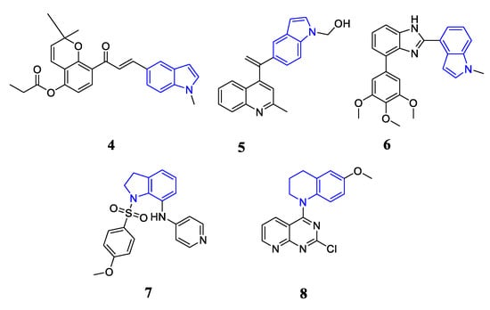 N-containing heterocyclic skeleton is one of most attractive frameworks in bioactive compounds with strong pharmacological significance [26], especially the anti-cancer ability. For example, indole [27,28,29,30,31,32], indoline [33,34,35] and tetrahydroquinoline derivatives [36,37,38] have also been used to design novel colchicine binding site tubulin inhibitors with potent anti-cancer activity. Chalcone indole derivative 4 potently inhibited cancer cell growth with IC50 values ranging from 0.22 to 1.80 μM [30]. Compound 4 induced cell cycle arrest in G2/M phase and effectively inhibited the polymerization of tubulin. Quinoline-indole derivative 5 as an anti-tubulin agent targeting the colchicine binding site showed effective inhibition effect against tested cancer cell lines with IC50 values ranging from 2 to 11 nM together with significant in vitro inhibition of tubulin polymerization (IC50 = 2.09 μM) [31]. Benzimidazole-indole derivative 6 exhibited potent inhibitory effects on the growth of cancer cells with an average IC50 value of 50 nM together with significant in vitro inhibition of tubulin polymerization (IC50 = 2.52 μM) [32]. The 7-Aroyl-aminoindoline-1-sulfonamide 7 potently inhibited the tubulin polymerization (IC50 = 1.1 μM) by binding to colchicine binding site. Compound 7 effectively suppressed the growth of KB, MKN45, H460, HT29 and TSGH cells with IC50 values ranging from 8.6 nM to 10.8 nM [35]. Tetrahydroquinoline-pyrimidine [38] showed strong anti-proliferative activity (IC50 values ranging from 5.6 to 18.3 nM) via tubulin polymerization inhibition and potently inhibited tumor growth in an A375 melanoma xenograft model (Figure 2).