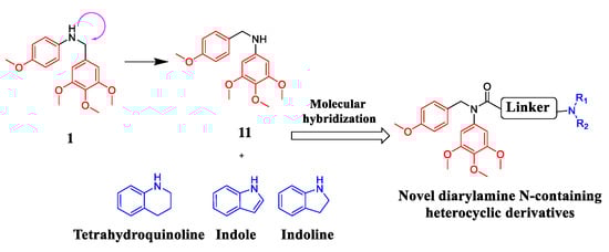 Based on the above findings and as the continuation of our group work on colchicine binding site tubulin inhibitors, we designed and synthesized a series of diarylamide N-containing heterocyclic derivatives by the combination of vicinal diaryl core and N-containing heterocyclic skeleton into one hybrid though proper linkers (Figure 3). Among of these compounds, compound 15b was identified as a tubulin inhibitor with potent anti-cancer activity.