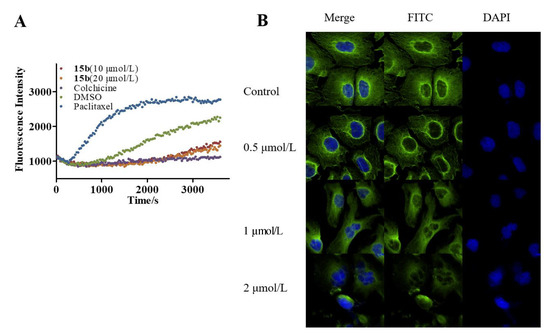 As its target protein, inhibitory effects on tubulin polymerization of compound 15b was first to be detected. Cell free tubulin polymerization assay was performed to evaluate anti-tubulin polymerization activity of compound 15b at different concentrations with the famous tubulin inhibitors colchicine and paclitaxel. As shown in Figure 4A, when tubulin was incubated with 15b (10 µM and 20 µM), the increased tendency of the fluorescence intensity was obviously slowed down with a similar action to that of colchicine, which indicated that compound 15b inhibited tubulin polymerization in a dose-dependent manner. However, the inhibitory activity of compound 15b on tubulin polymerization is less potent than that of colchicine, which is also consistent with results the anti-proliferative activity. Next, to investigate the effects to microtubules, compound 15b was selected to do immunofluorescence assay by staining tubulin. As shown in Figure 4B, cells’ morphologies were captured with immunofluorescence (IF) assay. MGC-803 cells treated with 15b at various concentrations (0.5 µM, 1 µM, and 2 µM) for 24 h resulted in disruption of microtubule networks, while the tubulins were polymerized to micro-tubes in control group. These results indicated that compound 15b produced the inhibition of tubulin polymerization a dose-dependent manner and caused microtubule network disruption in MGC-803 cells.