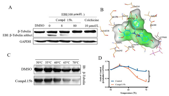 Compound 15b bind to the colchicine site. (A) EBI competition assay, cells were incubated with compound/colchicine and EBI; (B) The docking of the colchicine binding site and compound 15b; (C,D) The Cellular Thermo Shift Assay. Cell Lysates were incubated with or without compound 15b. Then were incubated in different temperatures.