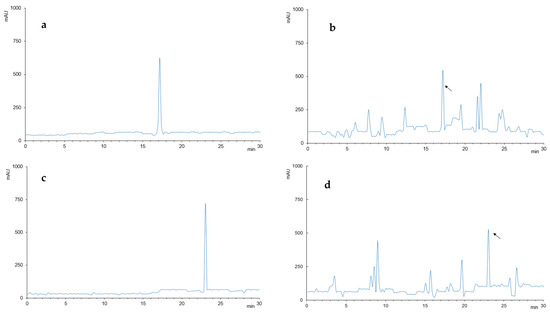 HPLC analysis of GTP, PPP, EP and PN. (a) EP, standard; (b) GTP, 1:5 mg/mL in water; (c) PN, standard; (d) PPP, 1:5 mg/mL in water.