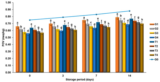 Changes in POV and meatballs during storage. The results are expressed as mean ± standard error. a–h For each day, columns representing different values are labeled with different letters.