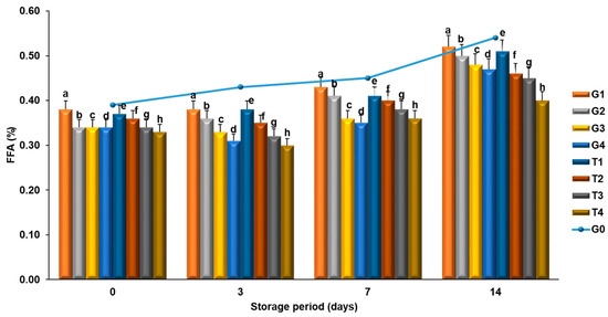 Samples (5 g) were dissolved with 30 mL of chloroform using a homogenizer (IKA Ultra-Turrax T18 Basic, Staufen, Germany) (10,000 rpm; 1 min). Whatman No. 1 was used to remove the filtrate. The resulting filtrate (added phenolphthalein) was titrated (0.01 N KOH). The FFA value was calculated with the formula [36].