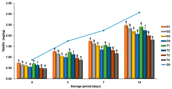 Changes in TBARS of meatballs during storage. The results are expressed as mean ± standard error. a–h For each day, columns representing different values are labeled with different letters.