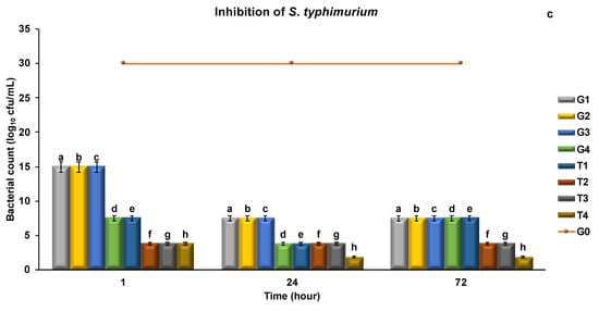 MIC values of meatballs determined at different times. (a) Inhibition of E. coli, (b) Inhibition of L.monocytogenes, (c) Inhibition of S. typhimurium. The results are expressed as mean ± standard error. a–h For each day, columns representing different values are labeled with different letters.