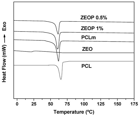 Differential scanning calorimetry thermograms corresponding to PCL, PCL matrix (PCLm), ZEO, ZEOP 0.5 % and ZEOP 1% formulations.